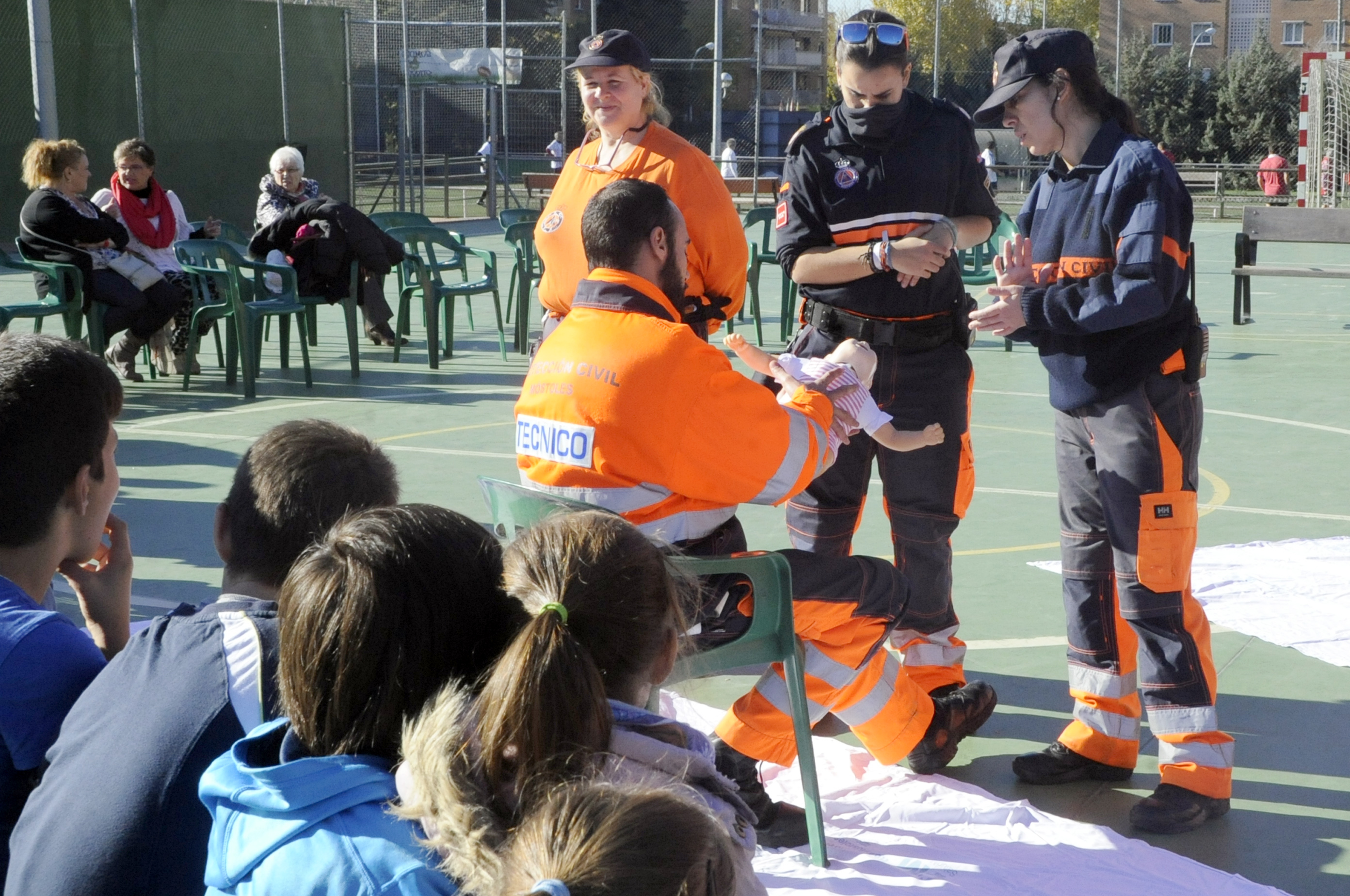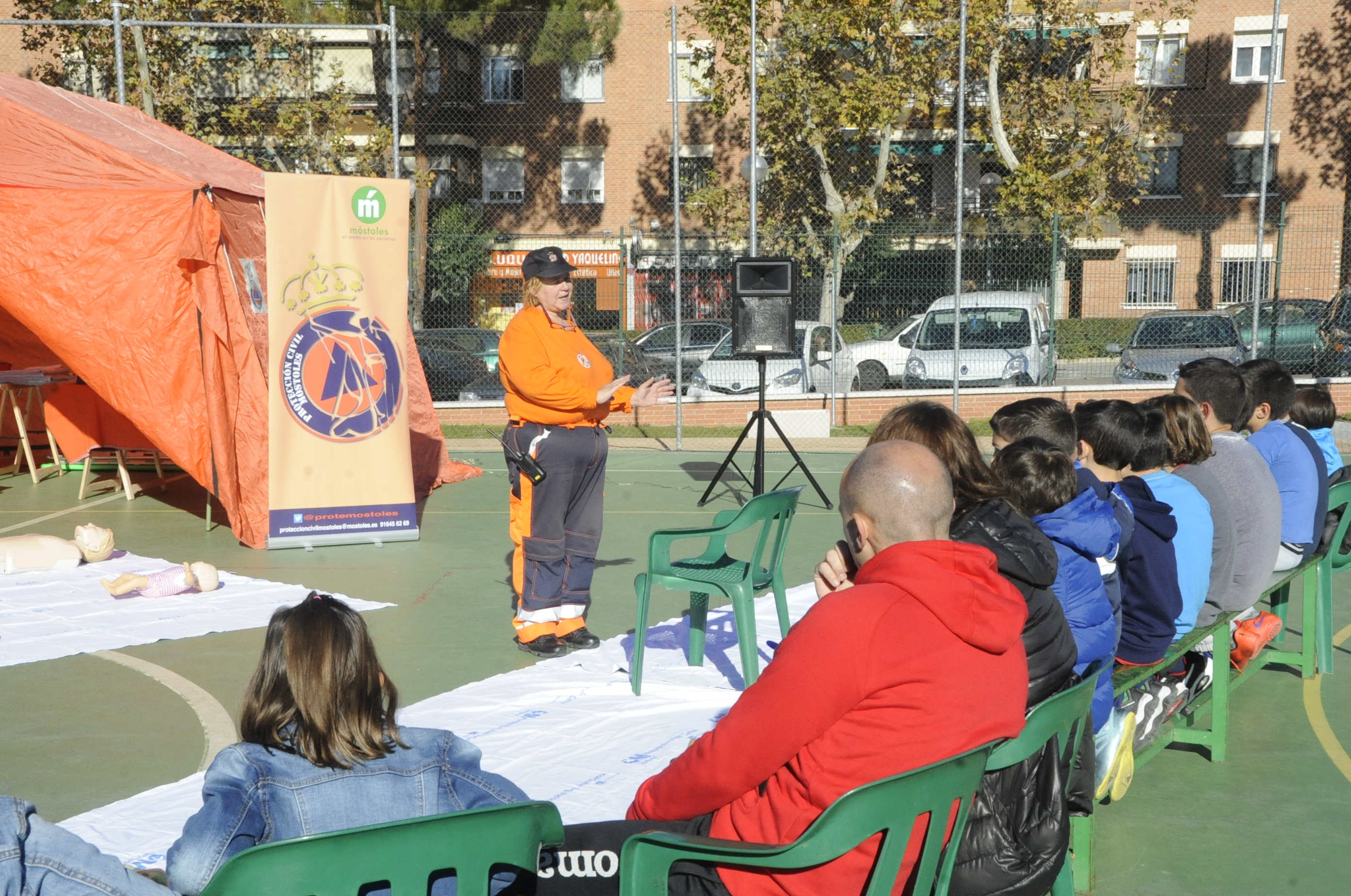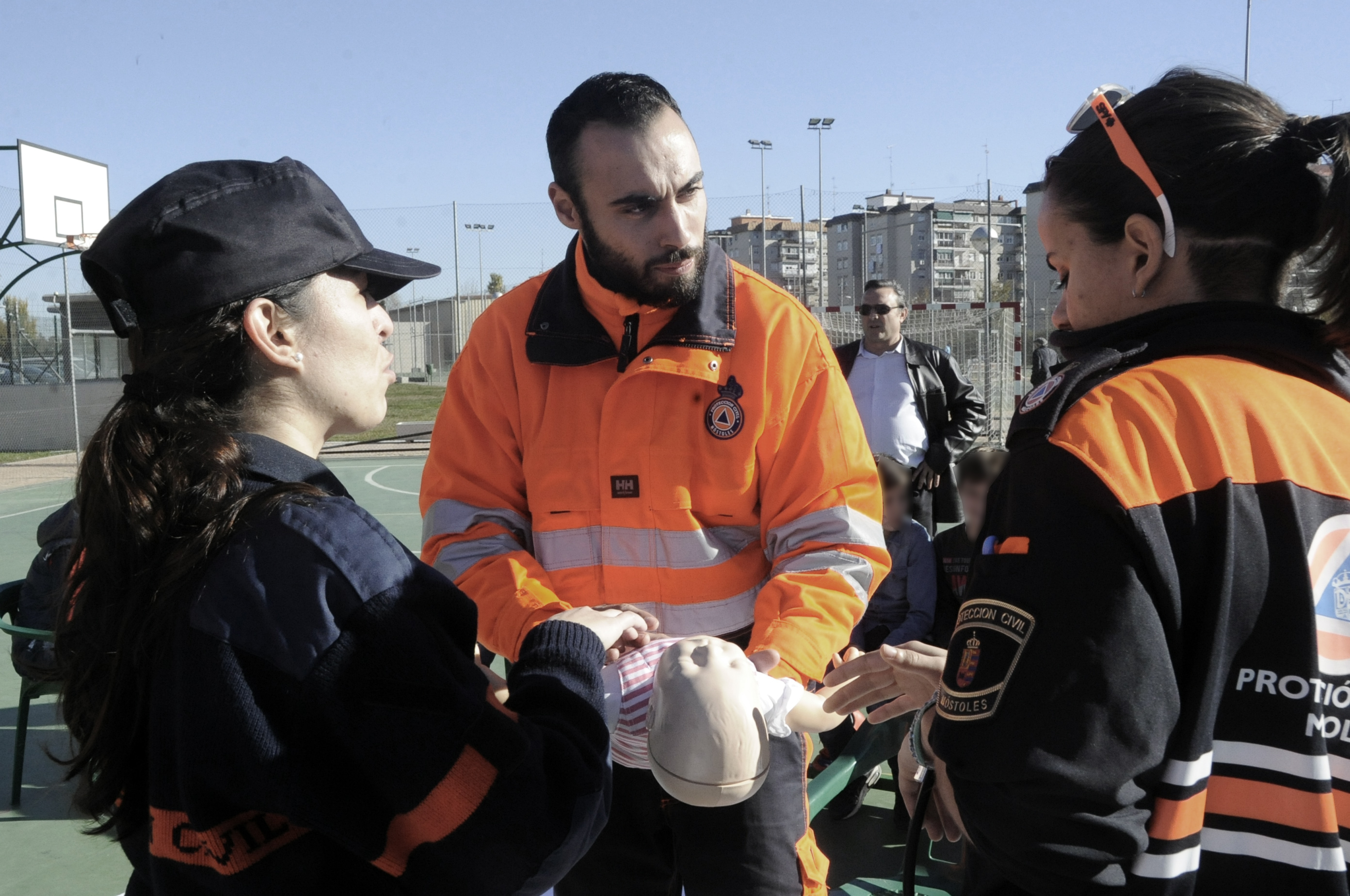 Dentro de las actividades didácticas que lleva a cabo la Agrupación de Protección Civil de Móstoles, con el objeto de que los vecinos puedan conocer de primera mano la labor que desarrolla, ayer domingo realizó una demostración de atención en primeros auxilios en las instalaciones del Club Deportivo Estoril II, donde asistió el Concejal de Deportes, Agustín Martín Cortés.