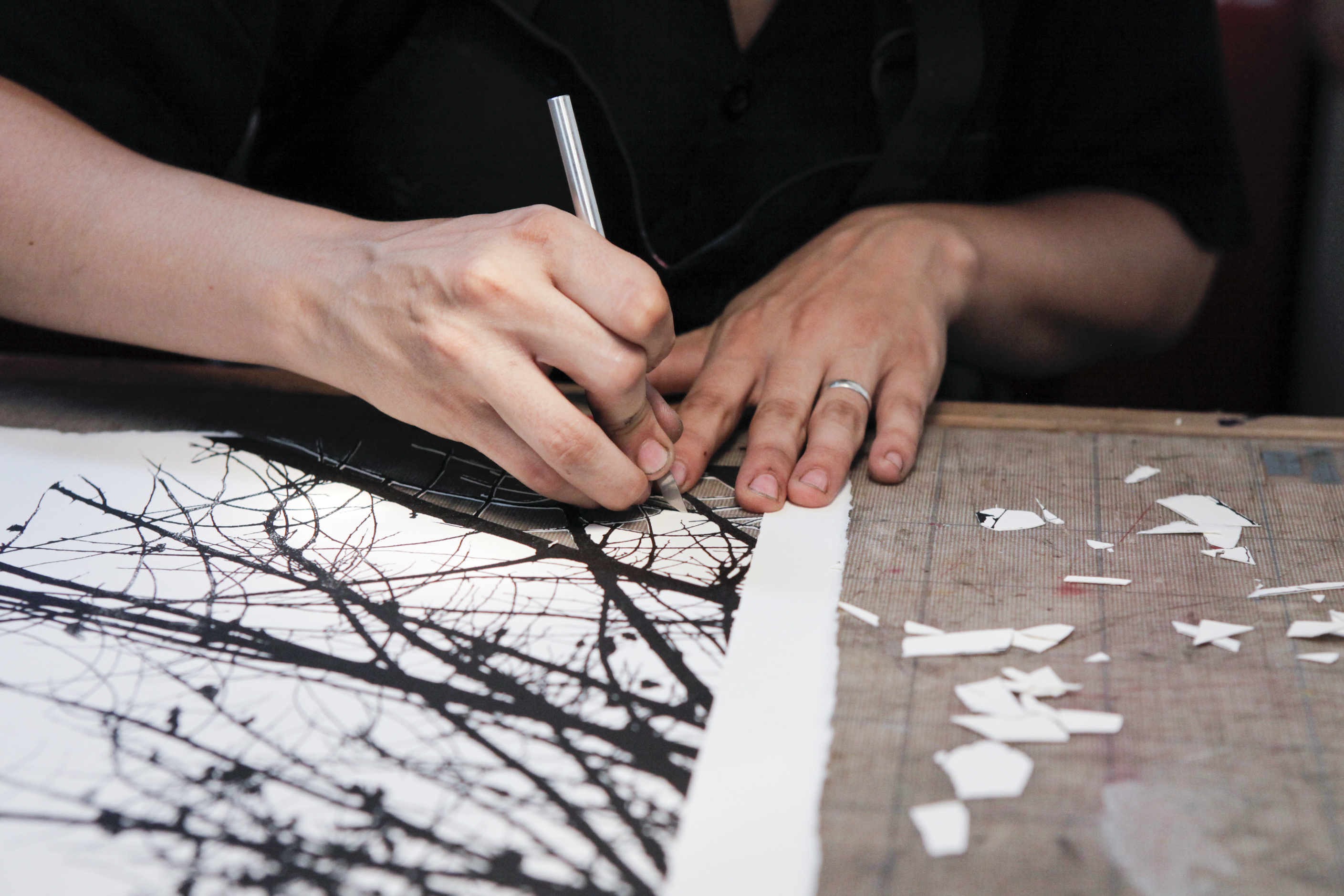 R.- Primero grabo las planchas de metacrilato mediante la técnica de la punta seca y el fresado mecánico manual, y estampo el grabado o la serigrafía en papel de gran calidad, después procedo al trabajo de recorte manual de la estampa con ayuda de un bisturí, para posteriormente montarlas en un marco de madera trabajada artesanalmente. El trabajo de recorte manual de las estampas originales, requiere mucho tiempo, concentración prolongada donde la paciencia para conseguir un corte preciso y limpio y el placer por el trabajo se convierten en indispensables para poder crear estas obras, es un gran esfuerzo físico y mental pero muy emocionante. Al recortar la estampa original y aislarla del fondo del marco, consigo que su propia sombra se proyecte en el fondo de la obra dándole tridimensionalidad y profundidad.