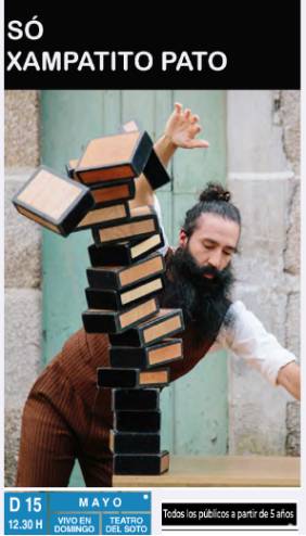 Por último, dentro de la programación de "A Escena Vivo en Domingo" este domingo 15 de mayo, a las 12:30 h se representará en el Teatro de El Soto la pieza "Só. Xampatito Pato". La obra está dirigida por Jesús Velasco Otero y Arturo Cobas. Escrita e interpretada por Jesús Velasco Otero.