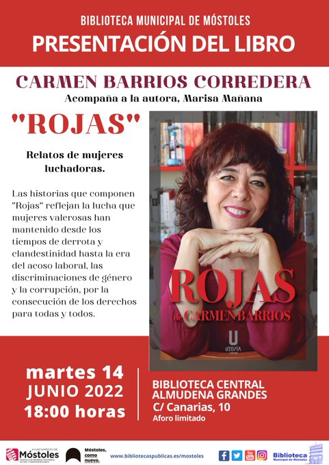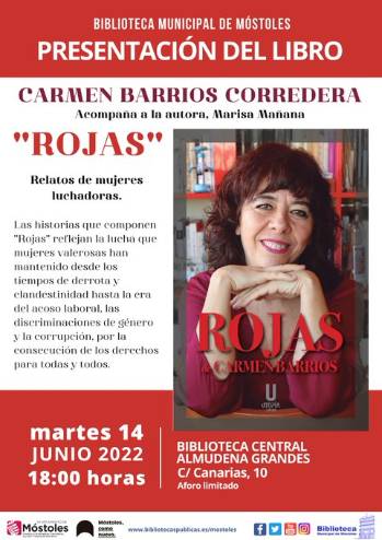 Entre las diversas actividades dirigidas a todos los públicos, se encuentra lapresentación, mañana martes en la Biblioteca Central Almudena Grandes, a las 18:00 h, del libro "Rojas" de Carmen Barrios Corredera. La obra se compone de historias que reflejan la lucha que mujeres valerosas han mantenido desde los tiempos de derrota y clandestinidad hasta la era del acoso laboral, las discriminaciones de género y la corrupción, por la consecución de los derechos para todas y todos.