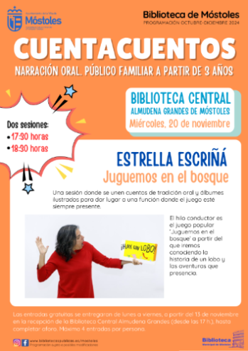 La Biblioteca Central Almudena Grandes acogerá otra cita literaria para niños a partir de tres años, como es el cuentacuentos "Juguemos en el bosque", a cargo de Estrella Escriñá. Tendrá lugar el miércoles 20, a las 17:30 h y 18:30 h, en 2 sesiones de 30 minutos. La entrada es gratuita previa retirada de invitaciones en el propio centro.