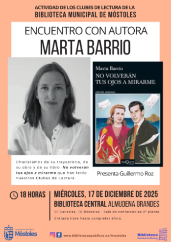 El miércoles 17 se llevará a cabo en la Biblioteca Central, a las 18:00 h, un encuentro de los participantes de los clubes de lectura de la biblioteca con la escritora Marta Barrio. Charlarán de su trayectoria, de su obra y de su libro "No volverán tus ojos a mirarme".