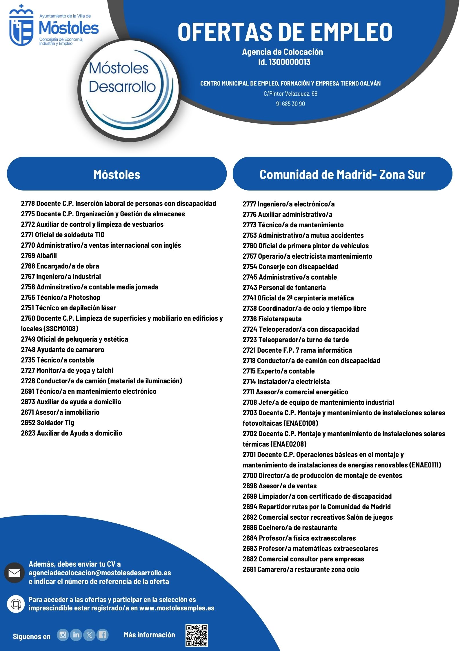 La Agencia de Colocación de Móstoles Desarrollo cuenta con cerca de 60 ofertas de empleo activas de sectores como administración, logística, comercial, hostelería, construcción y docencia.