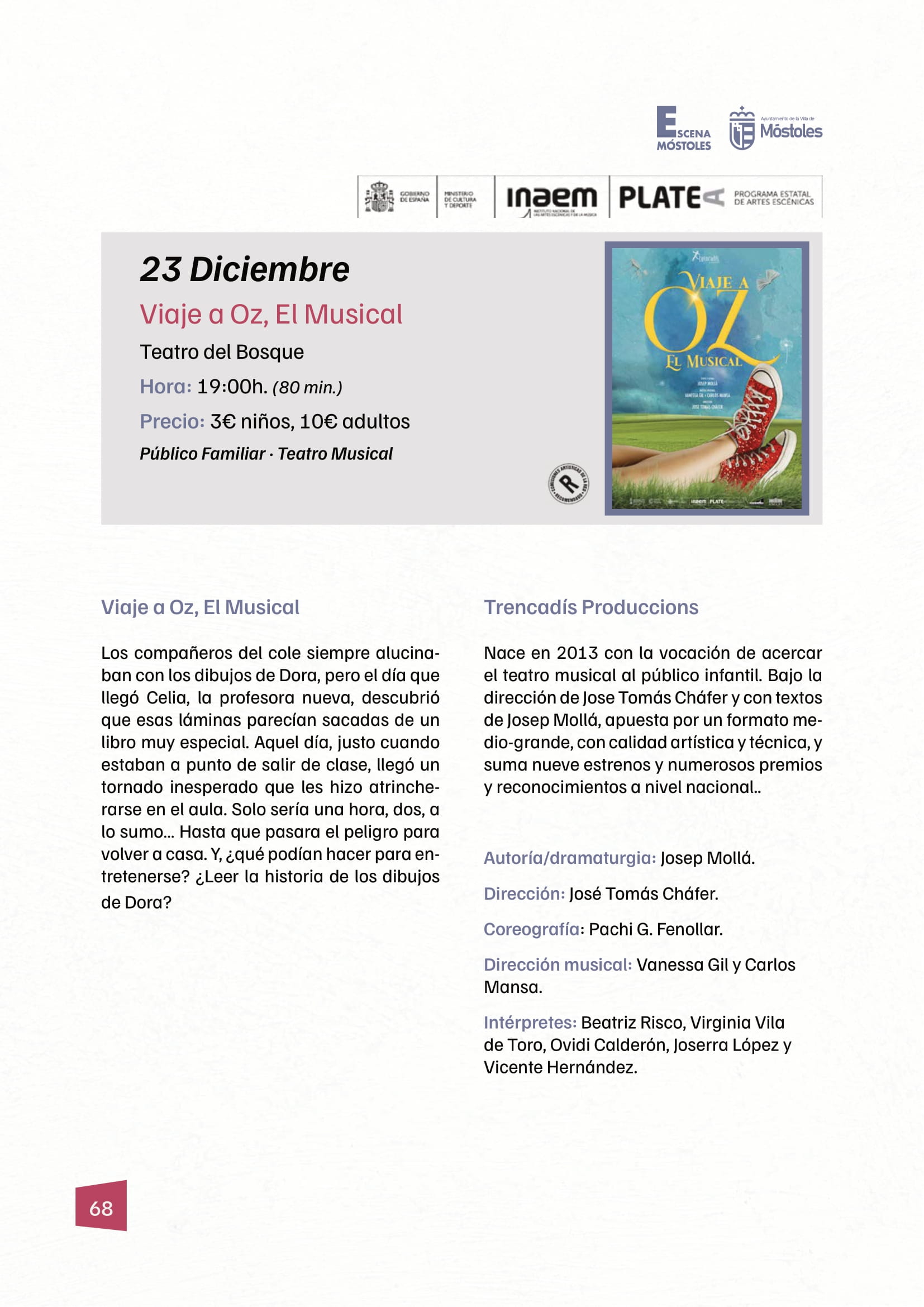 La jornada del martes se completa con el musical familiar "Viaje a Oz", de la compañía Trencadís Produccions, que se representará a las 19:00 h en el Teatro del Bosque. El espectáculo, con una duración aproximada de 80 minutos y dirigido a todos los públicos, narra la historia de un grupo de compañeros de colegio fascinados por los dibujos de Dora. La llegada de Celia, la nueva profesora, despertará su curiosidad al descubrir que aquellas láminas parecen extraídas de un libro muy especial.