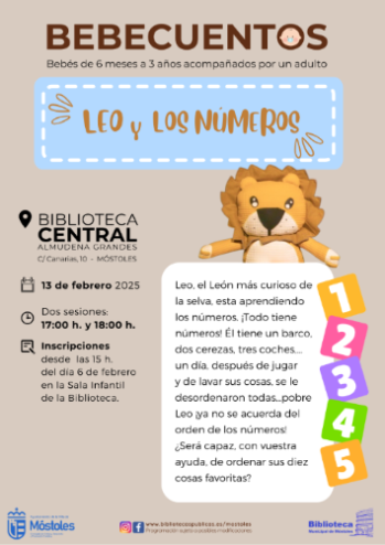 El mismo jueves, la Biblioteca Central Almudena Grandes acogerá el BebeCuentos "Leo y los números", a cargo de Trémola Teatro, a las 17:00 h y a las 18:00 h (2 sesiones de 30 minutos). Niños de 6 meses a 3 años, acompañados de un adulto, podrán descubrir junto al león más curioso de la selva el aprendizaje de los números. La entrada es gratuita, previa retirada de invitaciones en la sala Infantil-Juvenil de la propia biblioteca.
