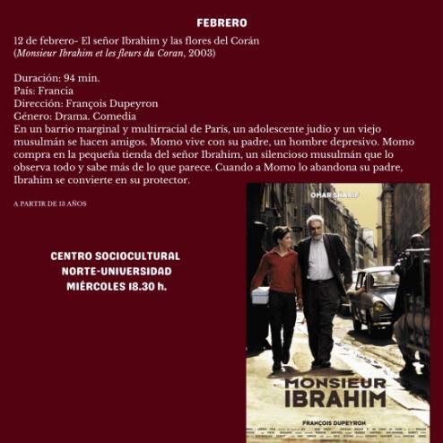 El ciclo Filmoteca, este mes de febrero, continúa el miércoles 12 con la proyección de la película "El señor Ibrahim y las flores del Corán" (Monsieur Ibrahim et les fleurs du Coran, 2003), en el Centro Sociocultural Norte-Universidad a las 18:30 h.