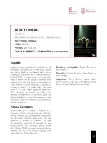 - El Teatro del Bosque acoge el sábado 15 "Legado", un espectáculo de flamenco que realiza un viaje a través de la danza española más vanguardista de dos jóvenes coreógrafos: Tania Martín y Carlos Romero.