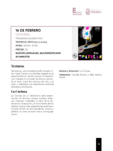 También el domingo por la mañana, gracias a Escena Vivo las familias podrán disfrutar de una original propuesta escénica "Texturas", para niños hasta 5 años de la compañía La Curiosa, en el Teatro El Soto a las 12:00 h y 13:15 h (2 sesiones), que podrán vivir una experiencia sensorial, visual y sonora.