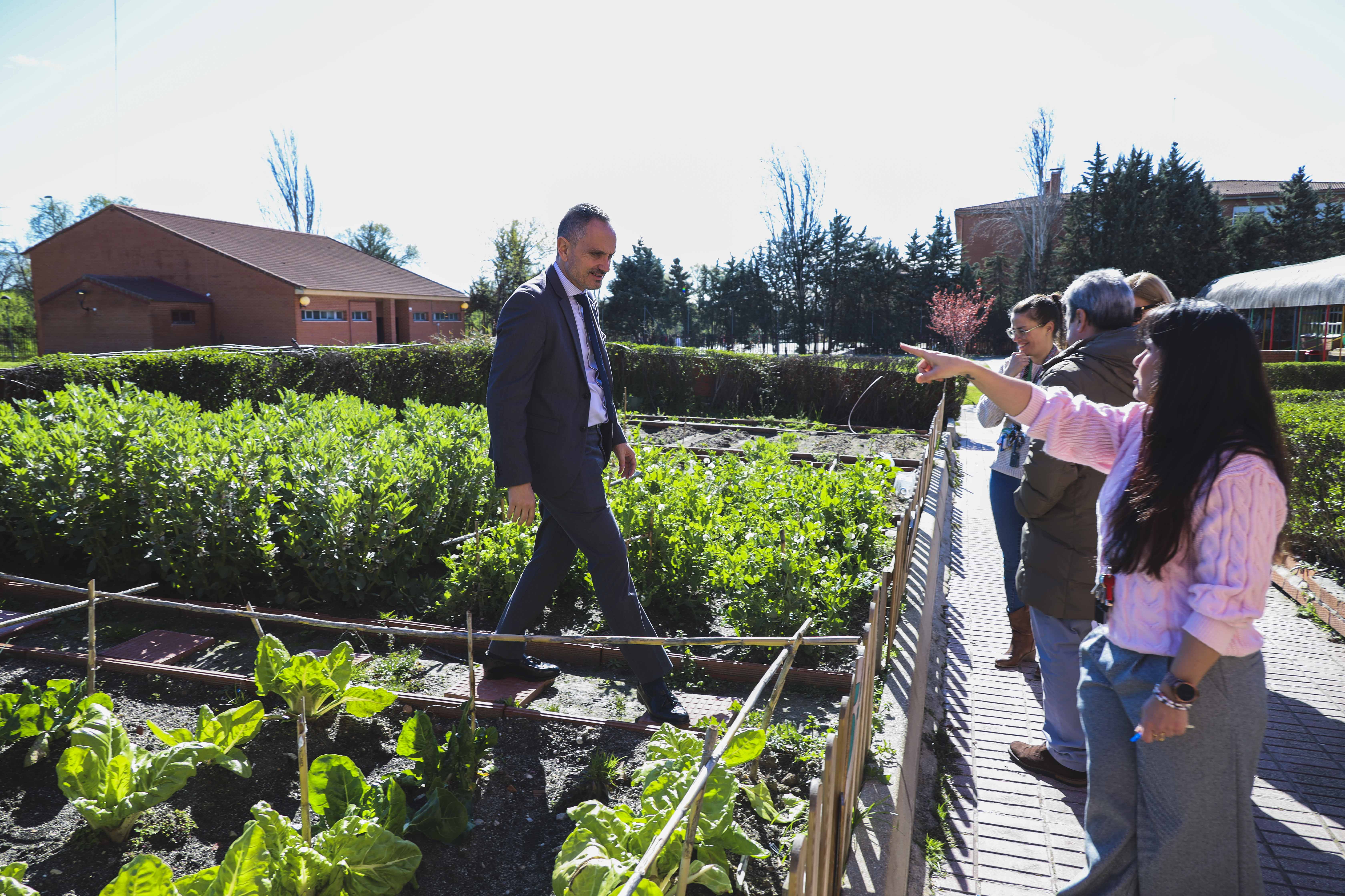 A su llegada al centro ha sido recibido por la directora Antonia Garzón, con quien han realizado un recorrido por las instalaciones del colegio. Además, han visitado el huerto, que forma parte de la Red de Huertos Urbanos Agroecológicos de Móstoles, y que es utilizado por los escolares como un espacio de participación y aprendizaje.