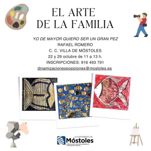 La programación comienza con dos visitas-taller gratuitas, los días 22 y 29 de octubre a las 11.00 horas, a la muestra "Yo de mayor quiero ser un gran pez", de Rafael Romero, que se expone en la Sala 1 del Centro Cultural Villa de Móstoles hasta el 8 de noviembre.
