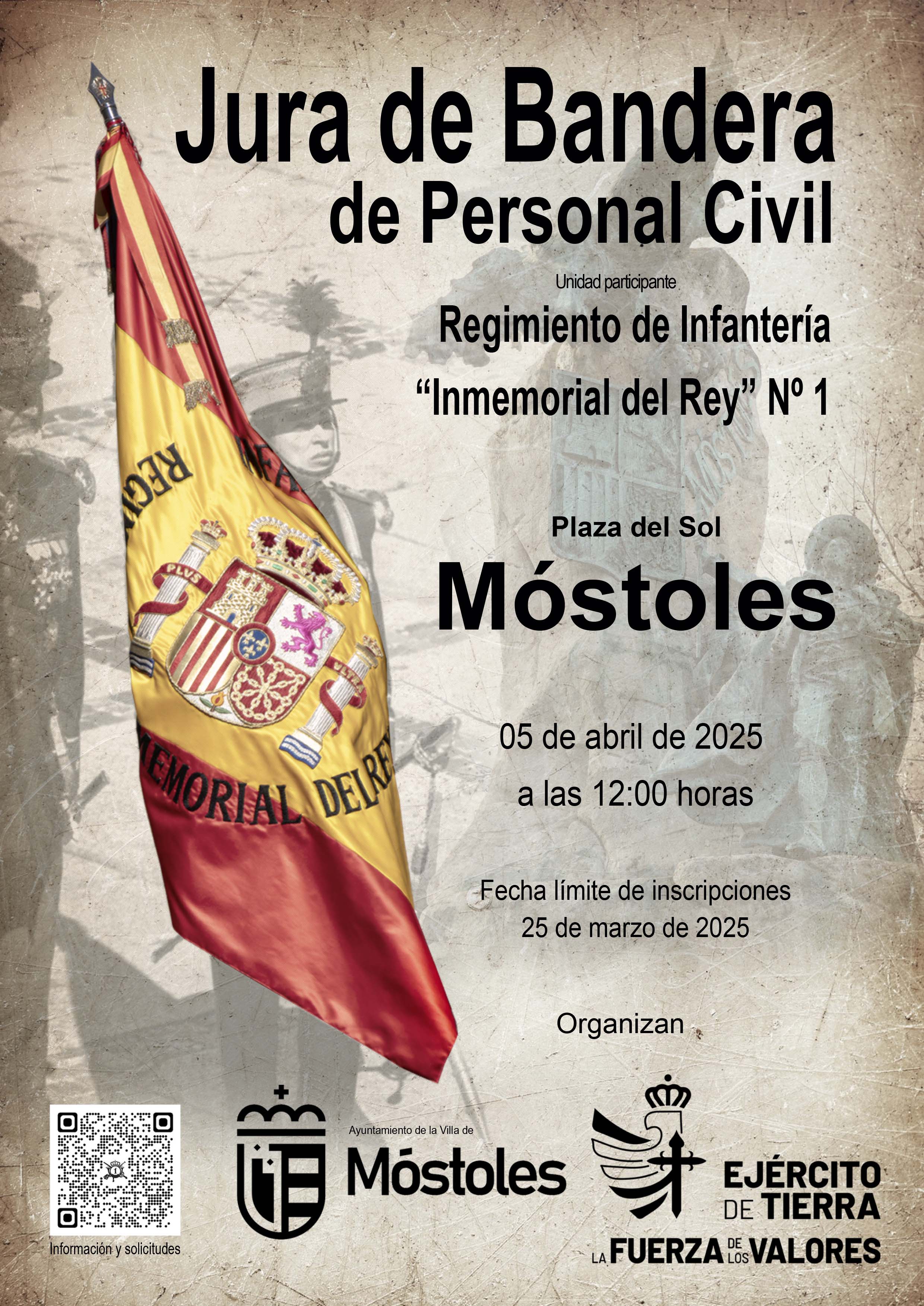 - El Ayuntamiento de Móstoles, junto al Regimiento de Infantería "Inmemorial del Rey" Nº 1 del Ejército de Tierra, va a celebrar este sábado 5 de abril la Jura de Bandera para personal civil.