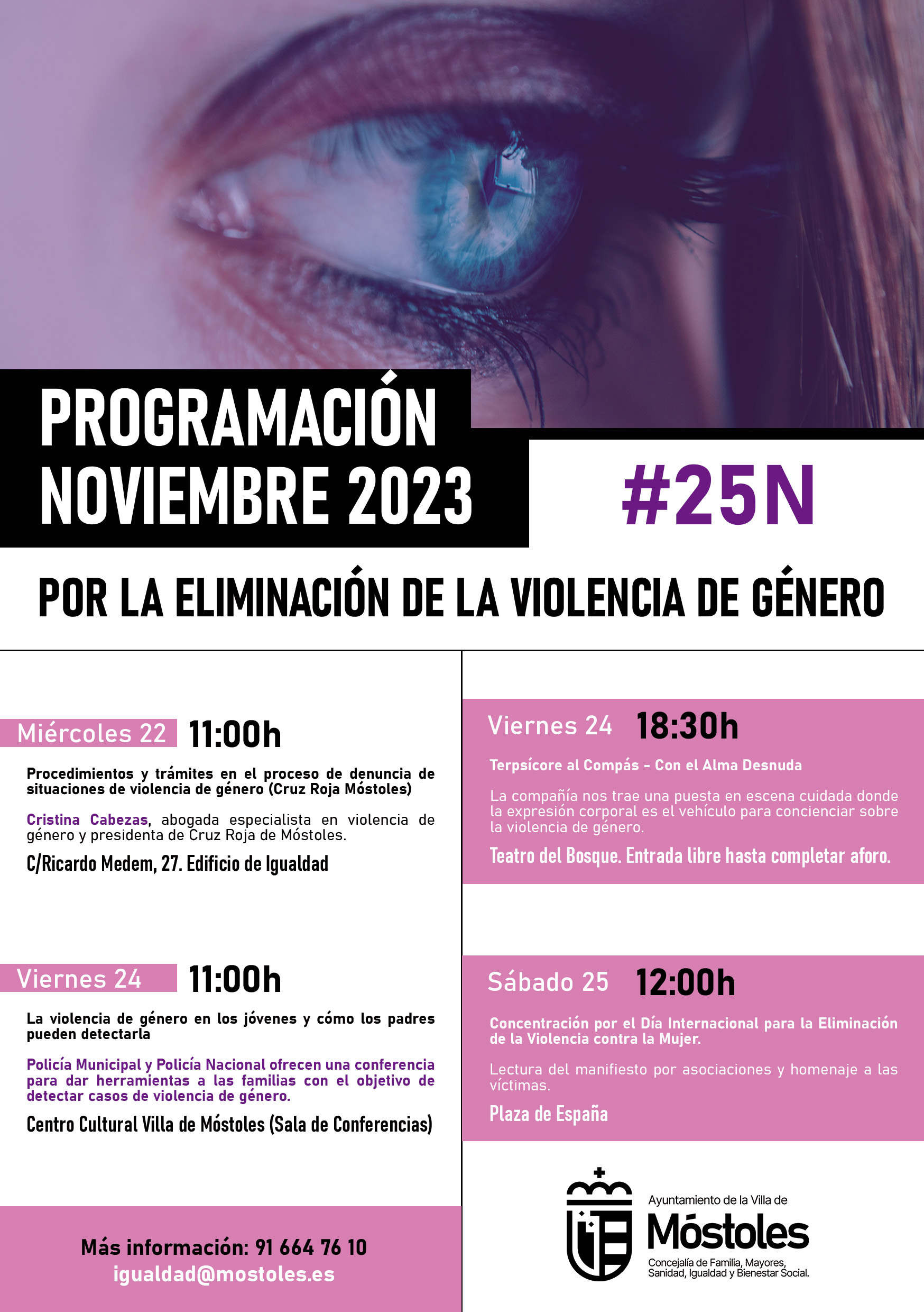 El Ayuntamiento de Móstoles, a través de la Concejalía de Familia, Mayores, Sanidad, Igualdad y Bienestar Social, se suma a la conmemoración del Día Internacional de la Eliminación de la Violencia contra la Mujer que se celebra el 25 de noviembre. Nuestra ciudad contará con una programación de actividades y actos institucionales durante toda la semana para mostrar su rechazo a una lacra que se ha cobrado la vida de 52 mujeres en lo que va de año.