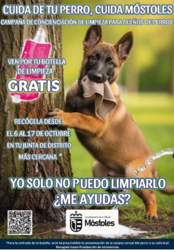 El Ayuntamiento de Móstoles, a través de la Concejalía de Deportes y Sanidad, va a distribuir, de manera gratuita, botellas de limpieza a los dueños de los perros para que diluyan los orines en la vía pública y mantenerla limpia.
