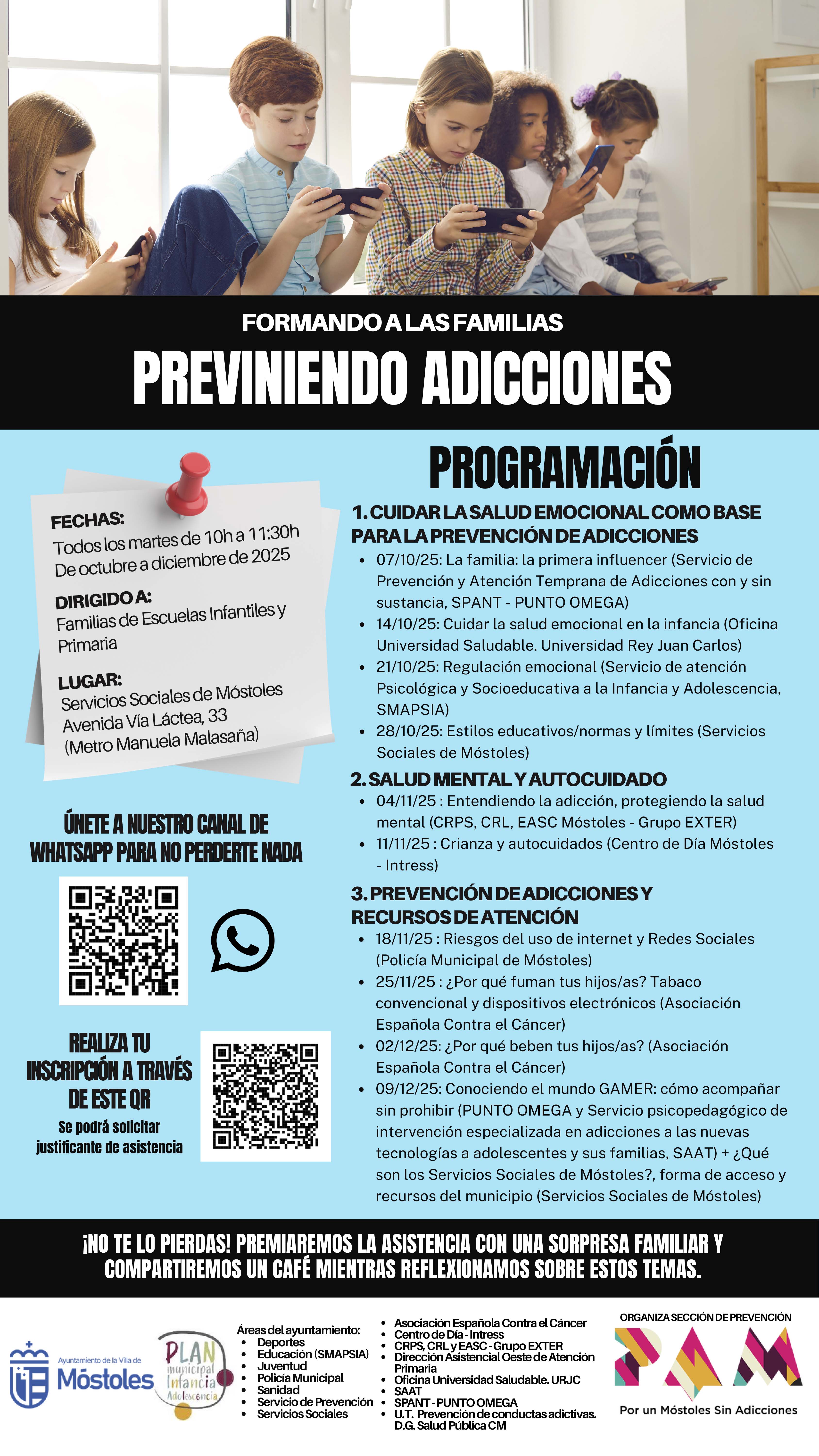 "Formando a las familias: previniendo adicciones", que se incluye dentro de la programación de la Escuela Municipal de Salud 2025-2026, comienza en octubre con talleres sobre el cuidado de la salud emocional como base para la prevención de adicciones. Este martes 7 se realiza "La familia como primera influencia", impartido por el Servicio de Prevención y Atención Temprana de Adicciones con y sin sustancias, SPANT – Punto Omega; el día 14, "Cuidar la salud emocional en la infancia", llevado a cabo por la Oficina Universidad Saludable de la Universidad Rey Juan Carlos; el día 21, "Regulación emocional", impartido por el Servicio de Atención Psicológica y Socioeducativa a la Infancia y Adolescencia (SMAPSIA); y el día 28, "Estilos educativos/normas y límites", realizado por Servicios Sociales de Móstoles.