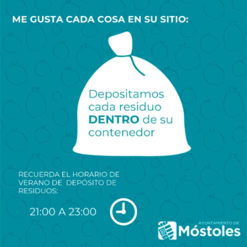 Las altas temperaturas pueden traer consigo la proliferación de malos olores en las inmediaciones de los contenedores donde se depositan los residuos. Para evitarlo, desde el Ayuntamiento de Móstoles, a través de la Concejalía de Seguridad, Emergencia, Movilidad y Medio Ambiente, se solicita la colaboración de los vecinos para que depositen los residuos en sus correspondientes contenedores a partir de las 21 h., evitando que permanezcan durante horas hasta su recogida.