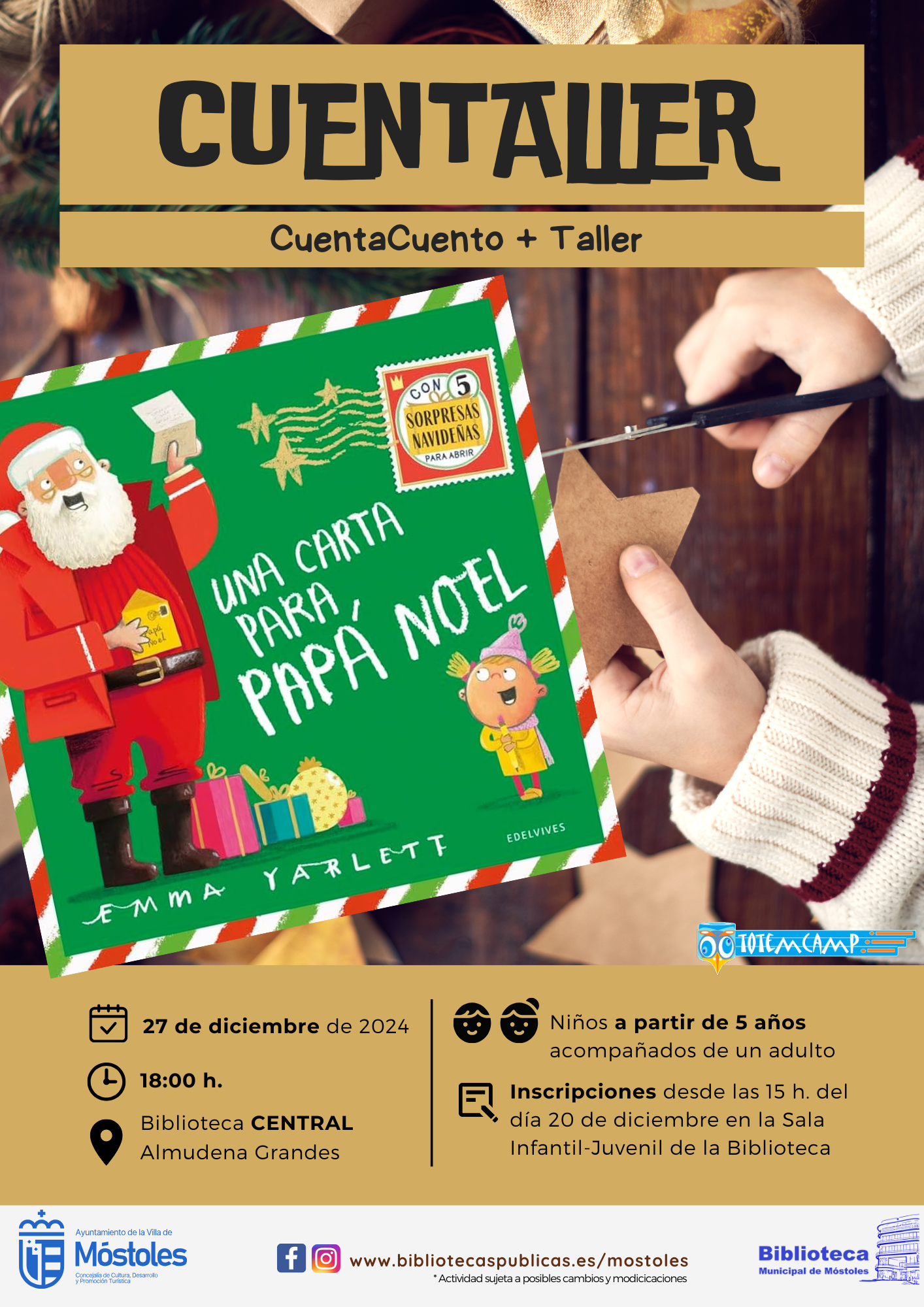 Otro taller muy navideño, "Una carta para Papá Noel", se llevará a cabo en la Biblioteca Central Almudena Grandes. Este CuenTaller combina primero un cuentacuentos en el que se contará la historia de Emma Yarlett que relata que una niña llamada Vera pide a Papá Noel algo muy especial en su carta, pero está chamuscada y es imposible de averiguar aunque Papá Noel y sus amigos mágicos del Polo Norte tratarán de descifrar los deseos que la niña plasmó por escrito en esa carta. Después de esta lectura, los niños participantes en el taller realizarán una manualidad para decorar la casa esta Navidad como es un original muñeco de nieve elaborado con un calcetín.