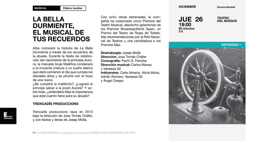 También el jueves, se podrá disfrutar del musical familiar "La Bella Durmiente, el musical de tus recuerdos", a cargo de Trencadís Produccions, en el Teatro del Bosque a las 19:00 h. En esta historia, Alba conocerá este cuento a través de los recuerdos de su abuela que relata que durante la fiesta del nacimiento de la princesa Aurora, la malvada bruja Maléfica condenará a la inocente niña a un sueño eterno que comenzará cuando cumpla 16 años y se pinche con el huso de una rueca.