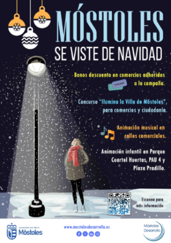Para ello, ha centrado su actividad en cuatro líneas de actuación mediante un concurso: "Ilumina la Villa de Móstoles"; concediendo "Ayuda para que el comercio y la hostelería de la Villa de Móstoles brille en la Navidad 2023"; poniendo a disposición de los ciudadanos "Bonos descuento Navidad 2023"; y, ofreciendo "animación y ocio en las calles de Móstoles" para todos los públicos.