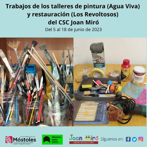El Centro Sociocultural Joan Miró acoge, del 5 al 18 de junio, una exposición con los trabajos realizados a lo largo del curso 2022-2023 por los alumnos de los talleres de pintura, que imparte la Asociación Agua Viva y de restauración de muebles, a cargo de la Asociación Los Revoltosos. La propuesta está impulsada por la Concejalía de Seguridad, Convivencia, Cultura y Transición Ecológica.