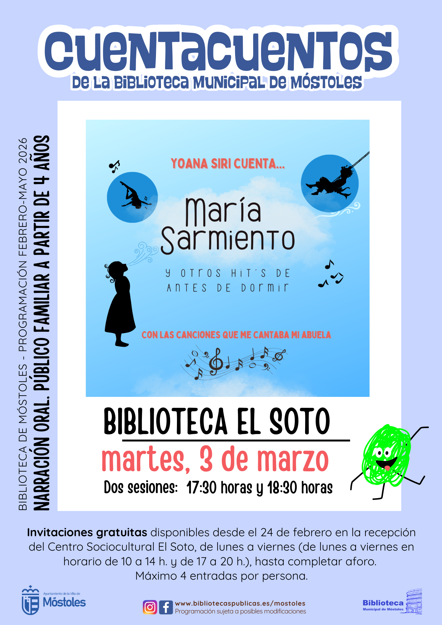También el martes 3, Yoana Siri lleva su cuentacuentos "María Sarmiento y otros hit´s de antes de dormir" a la biblioteca del Centro Sociocultural El Soto a las 17:30 h y a las 18:30 h.