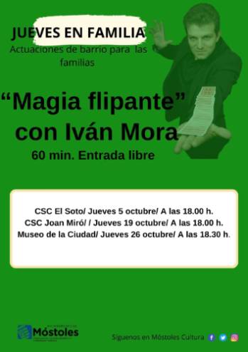La temporada arrancará el jueves 5 de octubre, a las 18:00 h en el Centro Sociocultural El Soto, con la puesta en escena del artista local Iván Mora, mago de gran prestigio, que nos enseñará sus trucos con "¡Magia flipante!". Se trata de un espectáculo divertido, con canciones populares y pequeñas coreografías para niños y mayores que serán protagonistas de este divertido show.