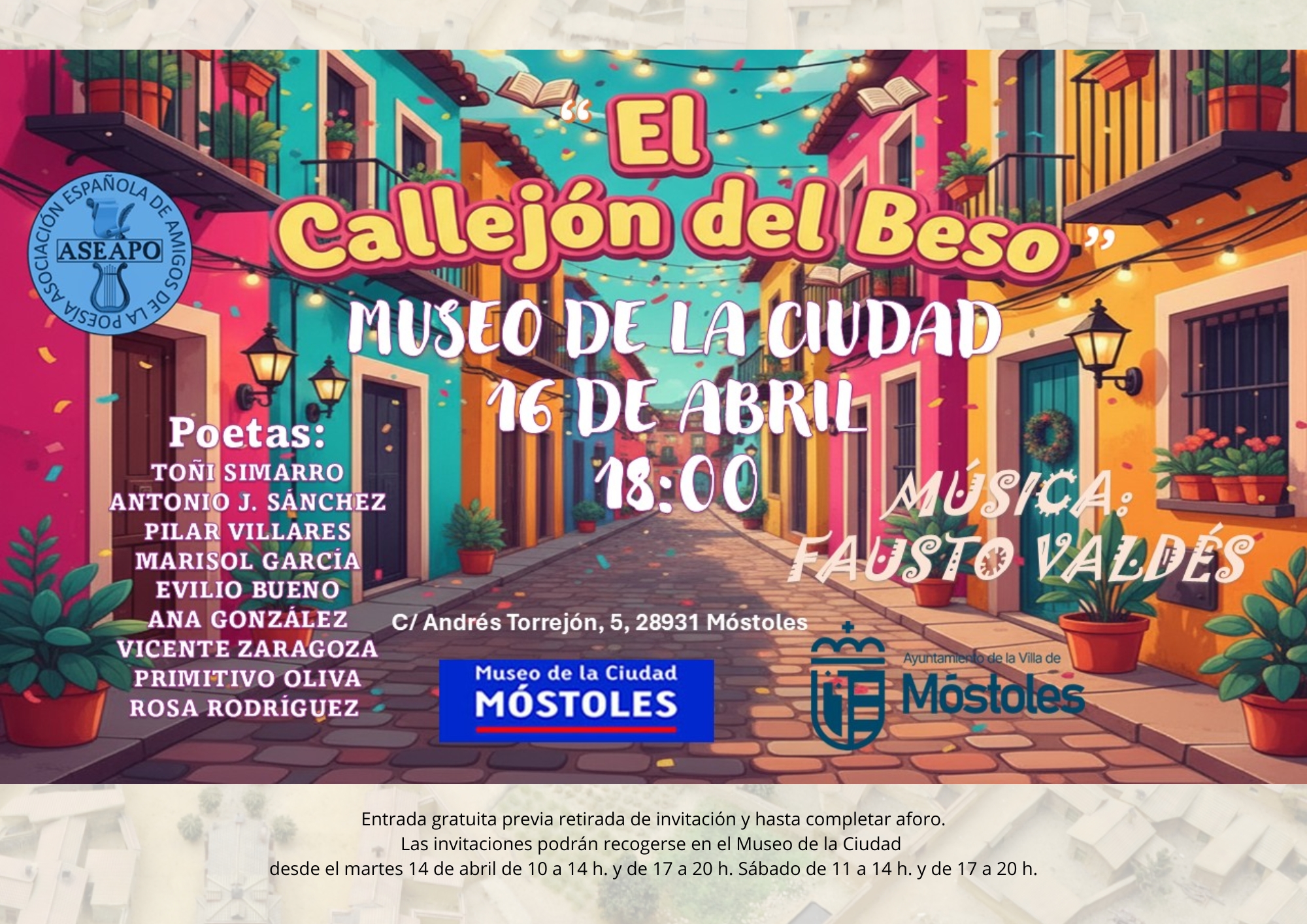 El jueves 16, en el Museo de la Ciudad se celebrará una declamación de poemas con música bajo el título "El callejón del beso", a las 18:00 h. Esta cita poética, a cargo de la Asociación Española Amigos de la Poesía (ASEAPO) contará con los poetas: Toñi Simarro, Antonio J. Sánchez, Pilar Villares, Marisol García, Evilio Bueno, Ana González, Vicente Zaragoza, Primitivo Oliva y Rosa Rodríguez. La ambientación musical correrá a cargo de Fausto Valdés. La entrada es gratuita previa retirada de invitaciones en el propio centro.