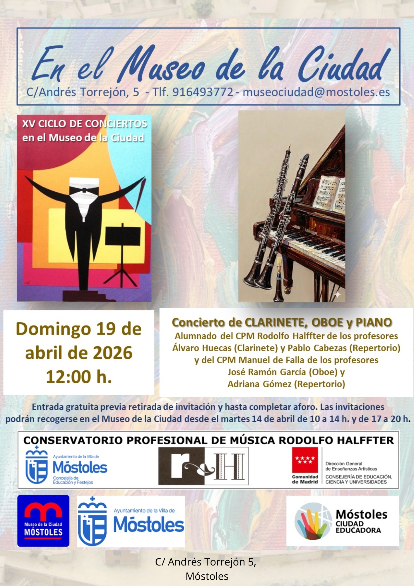 El domingo 19 de abril la música será protagonista gracias al "Concierto de clarinete, oboe y piano", que se enmarca en el XV Ciclo de Conciertos en el Museo de la Ciudad y que tendrá lugar a las 12:00 h. Las piezas musicales correrán a cargo de los alumnos del Conservatorio Profesional de Música Rodolfo Halffter, de los profesores Álvaro Huecas (clarinete) y Pablo Cabezas (repertorio) y del Conservatorio Profesional de Música Manuel de Falla, de los profesores José Ramón García (oboe) y Adriana Gómez. Se podrá disfrutar con entrada gratuita, previa retirada de invitaciones en el propio centro.