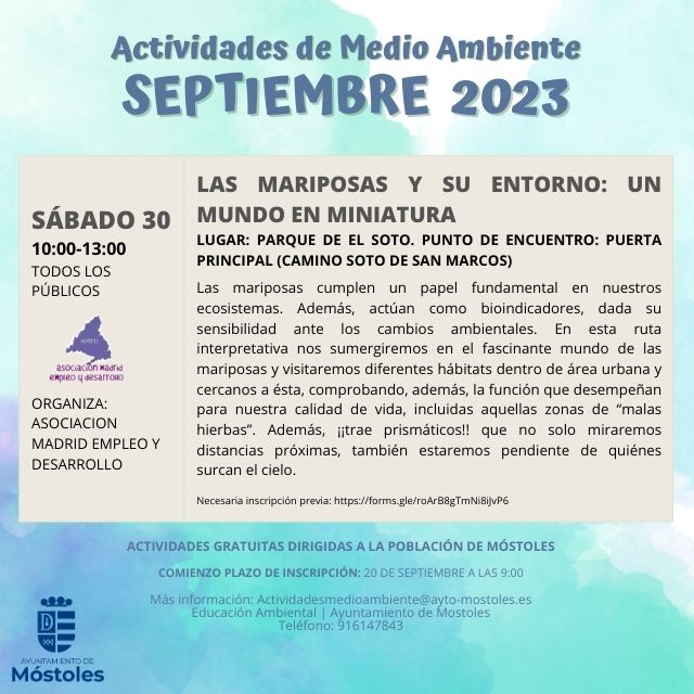 Para más información, los interesados pueden llamar al teléfono 916147843 o escribir a actividadesmedioambiente@mostoles.esEste enlace se abrirá en una ventana nueva.