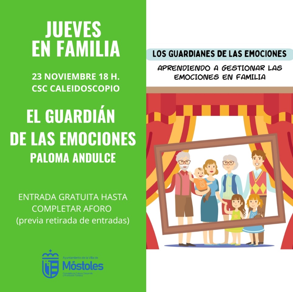 Esta semana vuelven las actuaciones gratuitas de pequeño formato para la familia gracias al programa "Jueves en Familia". La artista local Paloma Andulce estará el jueves 23 a las 18:00 h en el Centro Sociocultural Caleidoscopio con el cuento teatralizado "Los guardianes de las emociones". La actividad está recomendada a familias con niños a partir de los 6 años de edad.