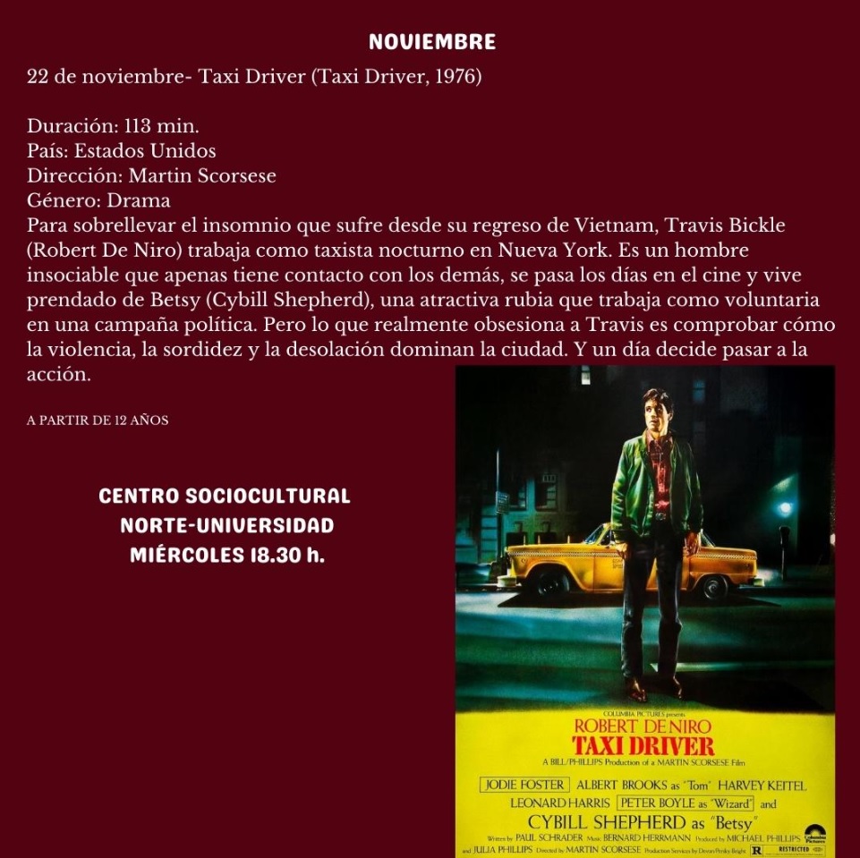 El programa de cine en versión original "Filmoteca" llega esta semana con "Taxi Driver", una película que encumbró a Martín Scorsese como director y a Robert de Niro como actor. Se proyectará el miércoles 22, a las 18:30 h, en el Centro Sociocultural Norte-Universidad.