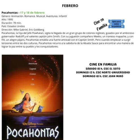 El mejor cine infantil llega el fin de semana de la mano de "Cine en Familia". La galardonada "Pocahontas" será la película que se proyecte en esta ocasión. Se podrá ver el sábado 17, a las 18:00 h, en el Centro Sociocultural El Soto y el domingo 18 a las 12:00 h en el Centro Sociocultural Norte-Universidad y a las 18:00 h en el Centro Sociocultural Joan Miró.