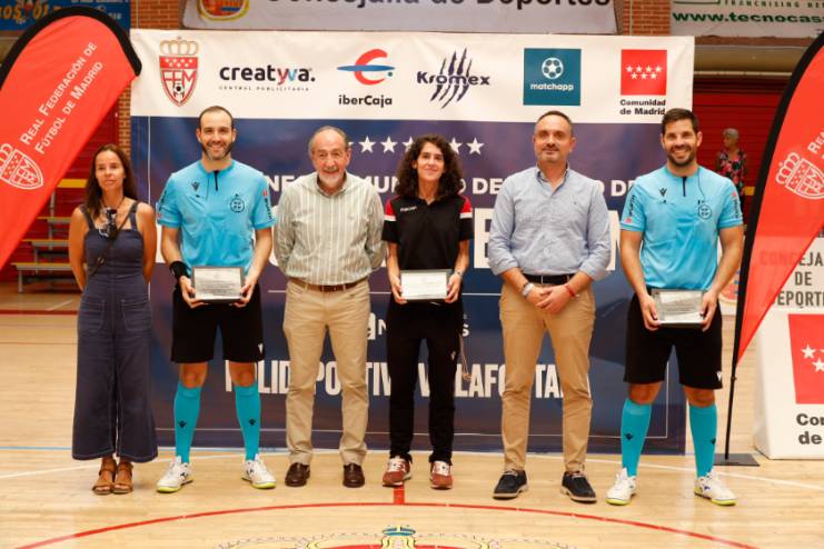 El Alcalde de Móstoles, Manuel Bautista, acompañado del Presidente de la Real Federación de Fútbol de Madrid, Francisco Díez, y la subdirectora de programas de la Dirección General de Deportes de la CAM, Virginia Blázquez, asistió a la entrega de trofeos.
