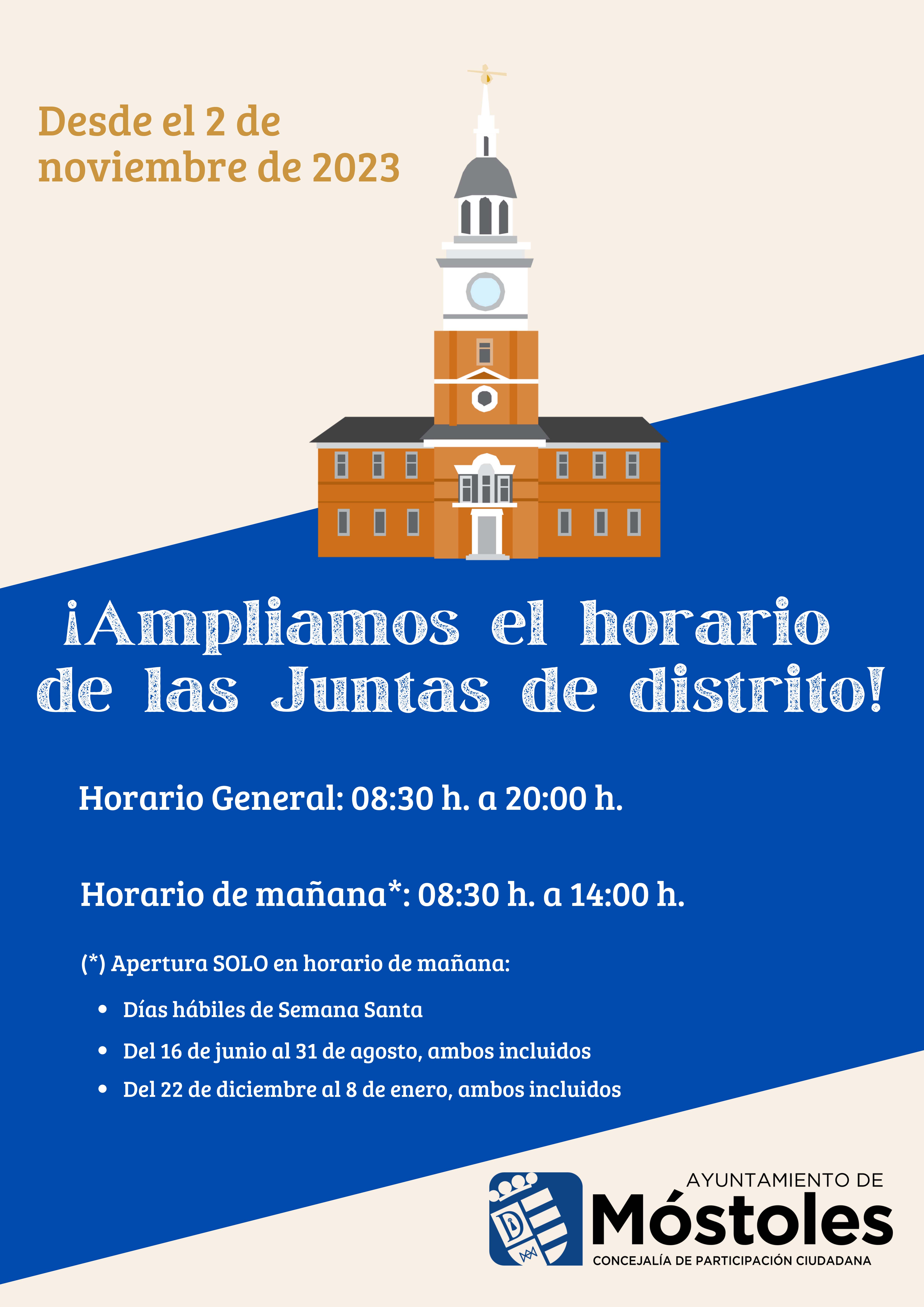 - A partir del 2 de noviembre, el horario de las Juntas de Distrito será de 8:30 h a 20:00 h, de lunes a viernes.