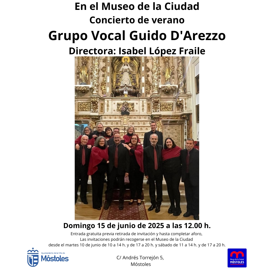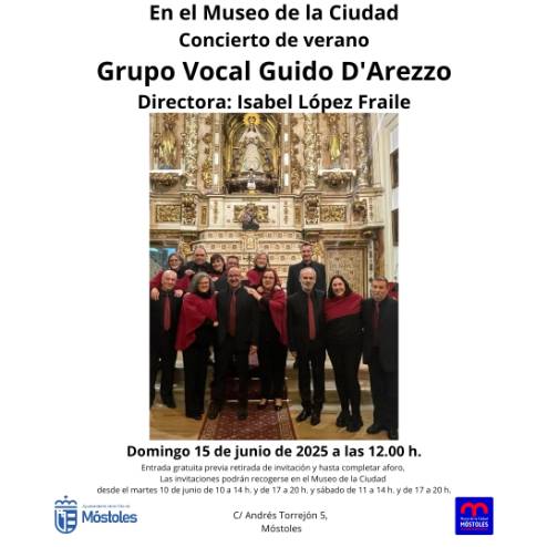 La oferta cultural de la semana finaliza con el Grupo Vocal Guido D'Arezzo, que ofrecerá su "Concierto de verano", dirigido por Isabel López Fraile. Será el domingo 15, a las 12:00 h, en el Museo de la Ciudad.