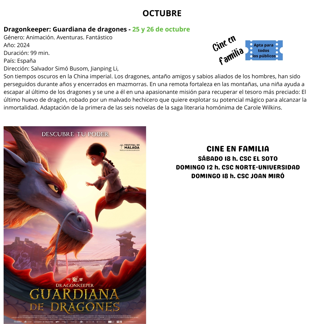 El fin de semana los más pequeños tienen una cita con el mejor cine infantil que trae el programa "Cine en Familia". La película de esta semana será "Guardiana de dragones (Dragonkeeper)", que se podrá ver el sábado 25, a las 18:00 h, en el Centro Sociocultural El Soto y el domingo 26 a las 12:00 h en el Centro Sociocultural Norte-Universidad y a las 18:00 h en el Centro Sociocultural Joan Miró.