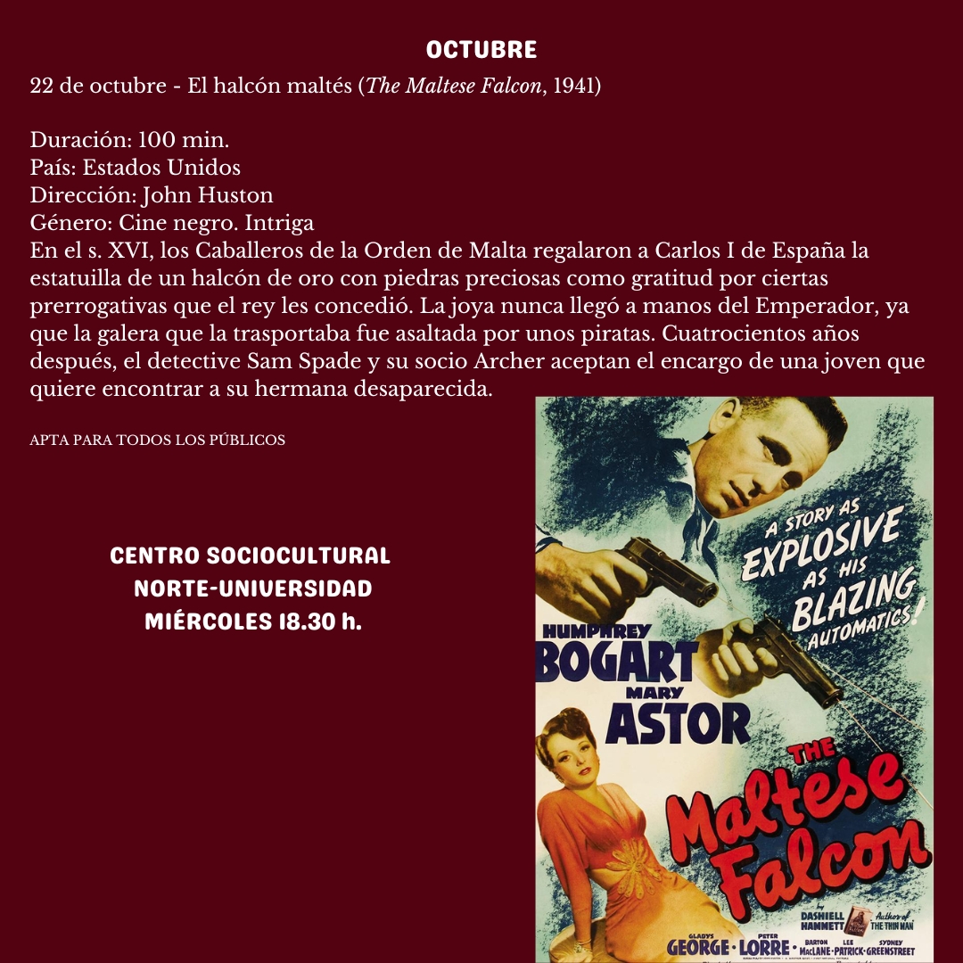 El ciclo de cine en versión original Filmoteca trae este miércoles 22 la película "El halcón maltés" (The Maltese Falcon, 1941), que se proyectará en el Centro Sociocultural Norte-Universidad a las 18:30 h.