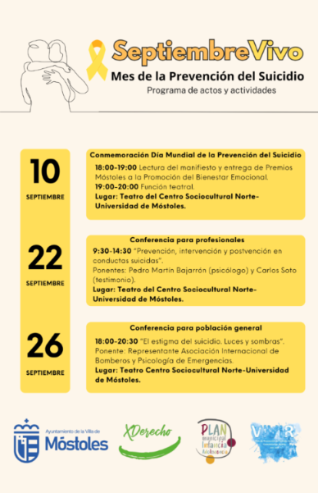 Móstoles establece septiembre como mes de prevención del suicidio, "Septiembre vivo", con el lazo amarillo como símbolo, dentro de un plan municipal desarrollado conjuntamente con el Plan de Infancia y Adolescencia (PLIA), en colaboración con entidades socio sanitarias y educativas del municipio y enmarcado en el Plan "Vivir" de la Comunidad de Madrid.