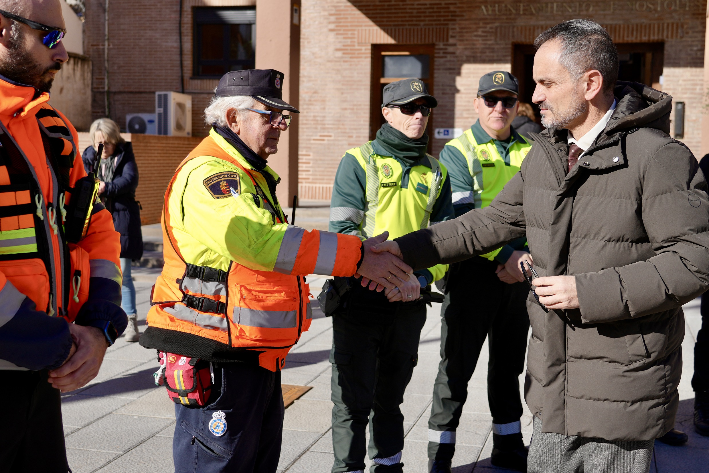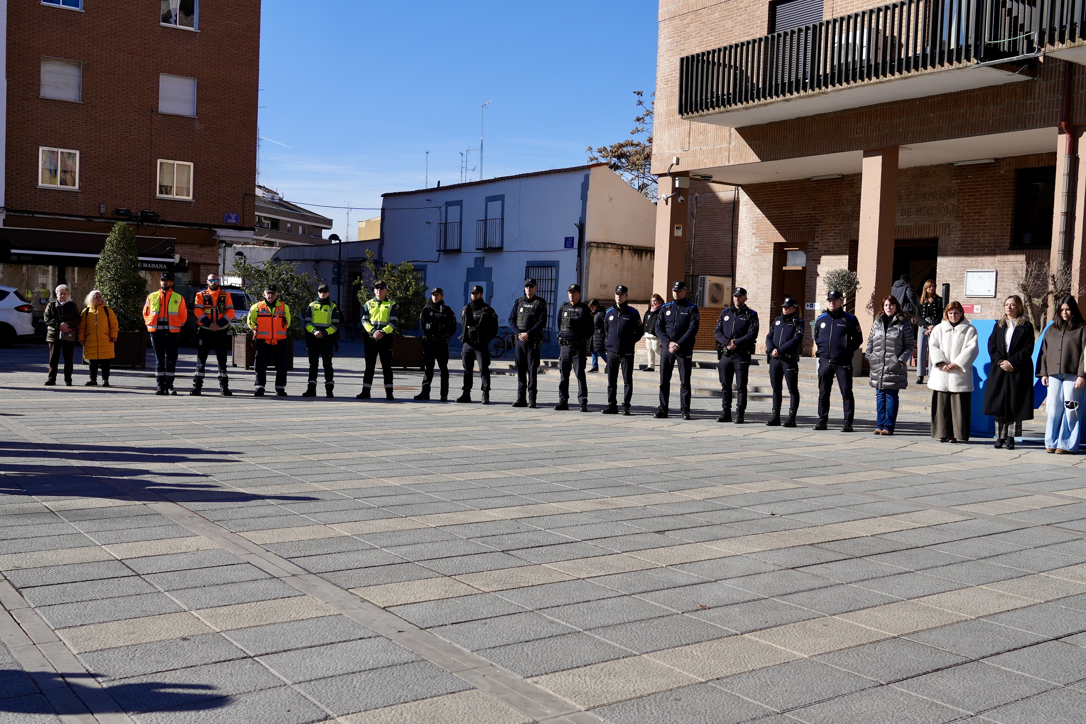 Al acto han asistido miembros de la Corporación municipal, representantes de Policía Municipal, Policía Nacional, Guardia Civil y Protección Civil, empleados municipales y vecinos de Móstoles, que se han congregado a las 12:00 h en la Plaza de España, frente a la Casa Consistorial.