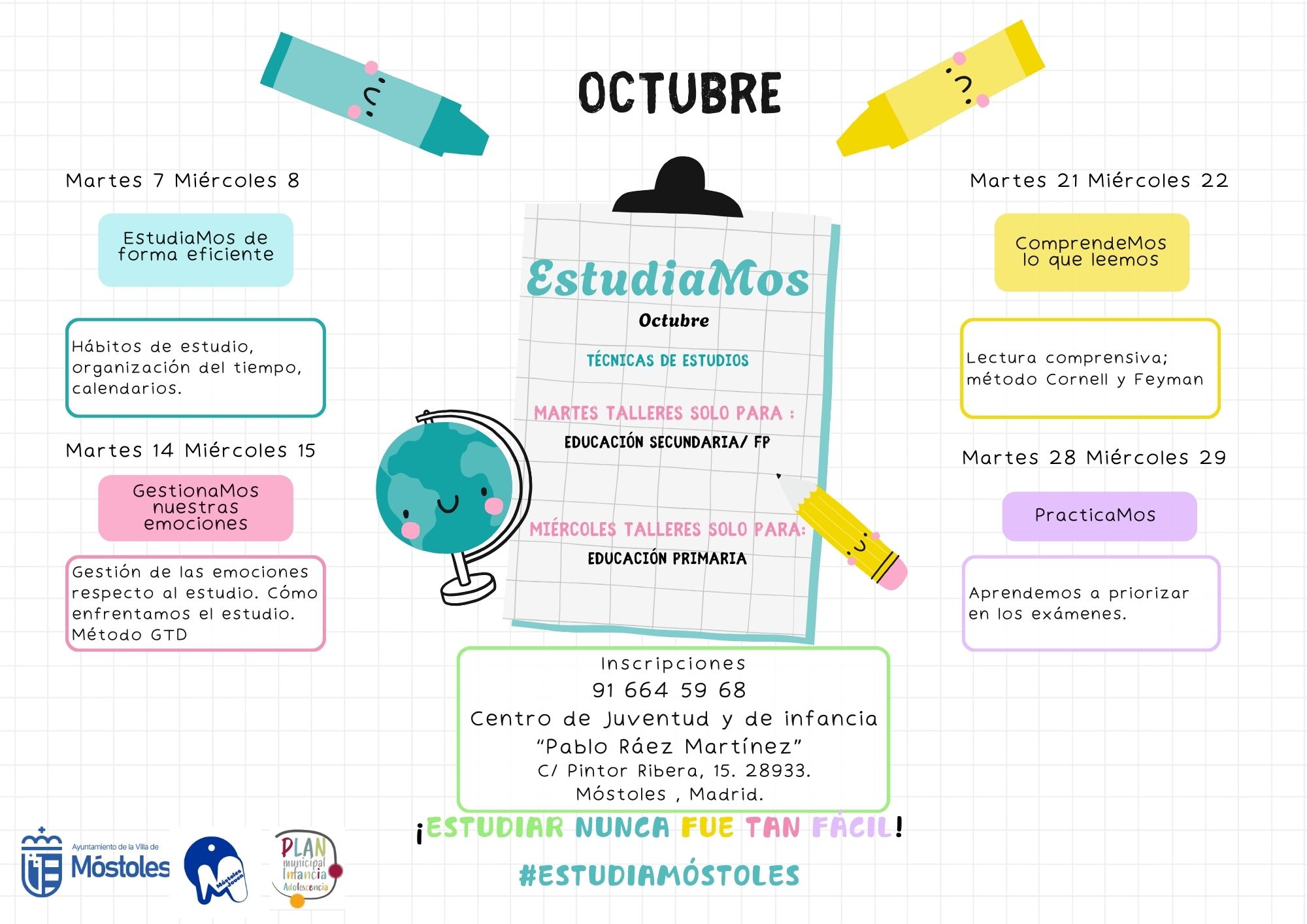 • "EstudiaMos de forma eficiente", "GestionaMos nuestras emociones", "ComprendeMos lo que leemos" y "PracticaMos" son los cursos que ofrece este mes de octubre el Ayuntamiento de Móstoles a niños de Primaria, Secundaria y Formación Profesional.