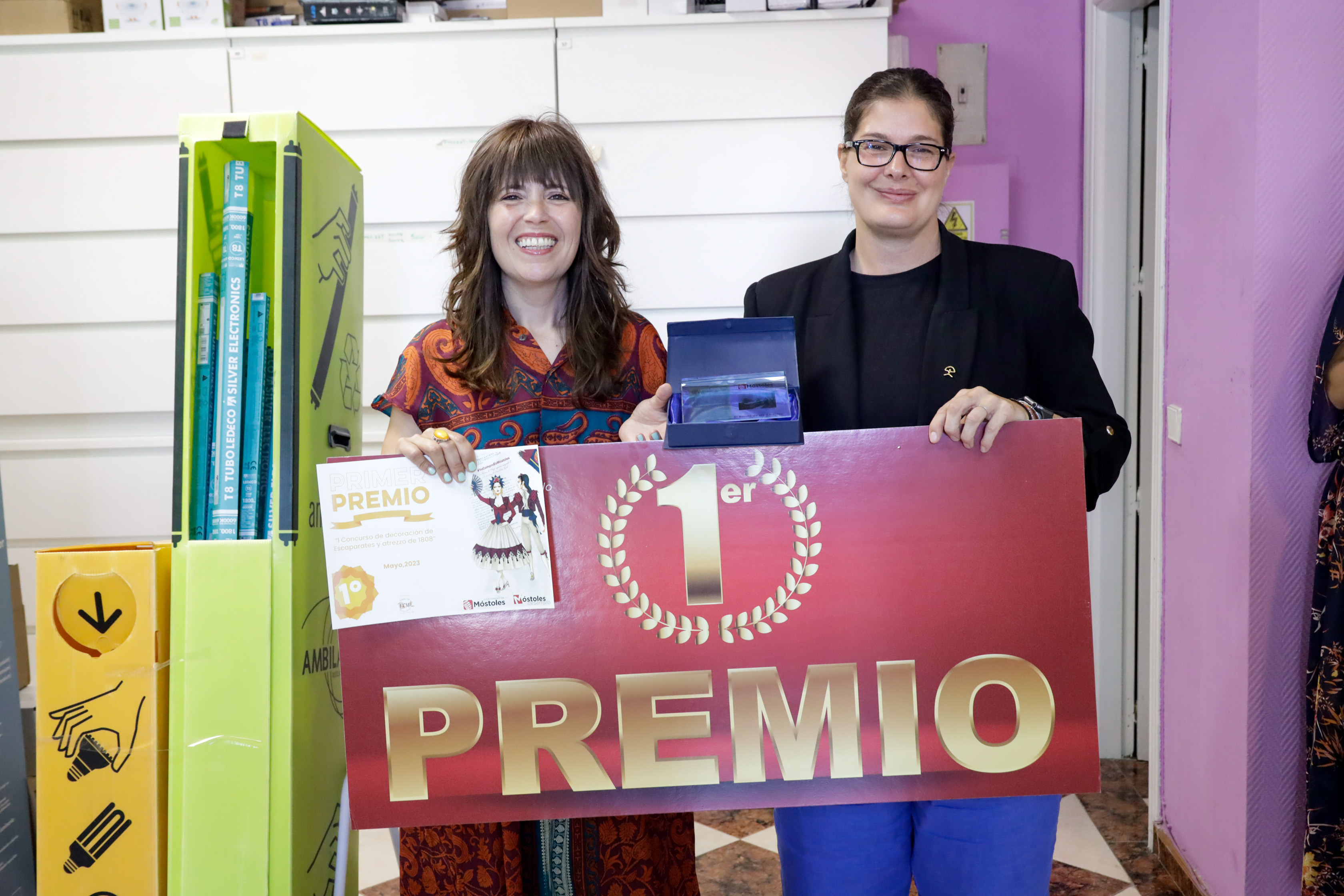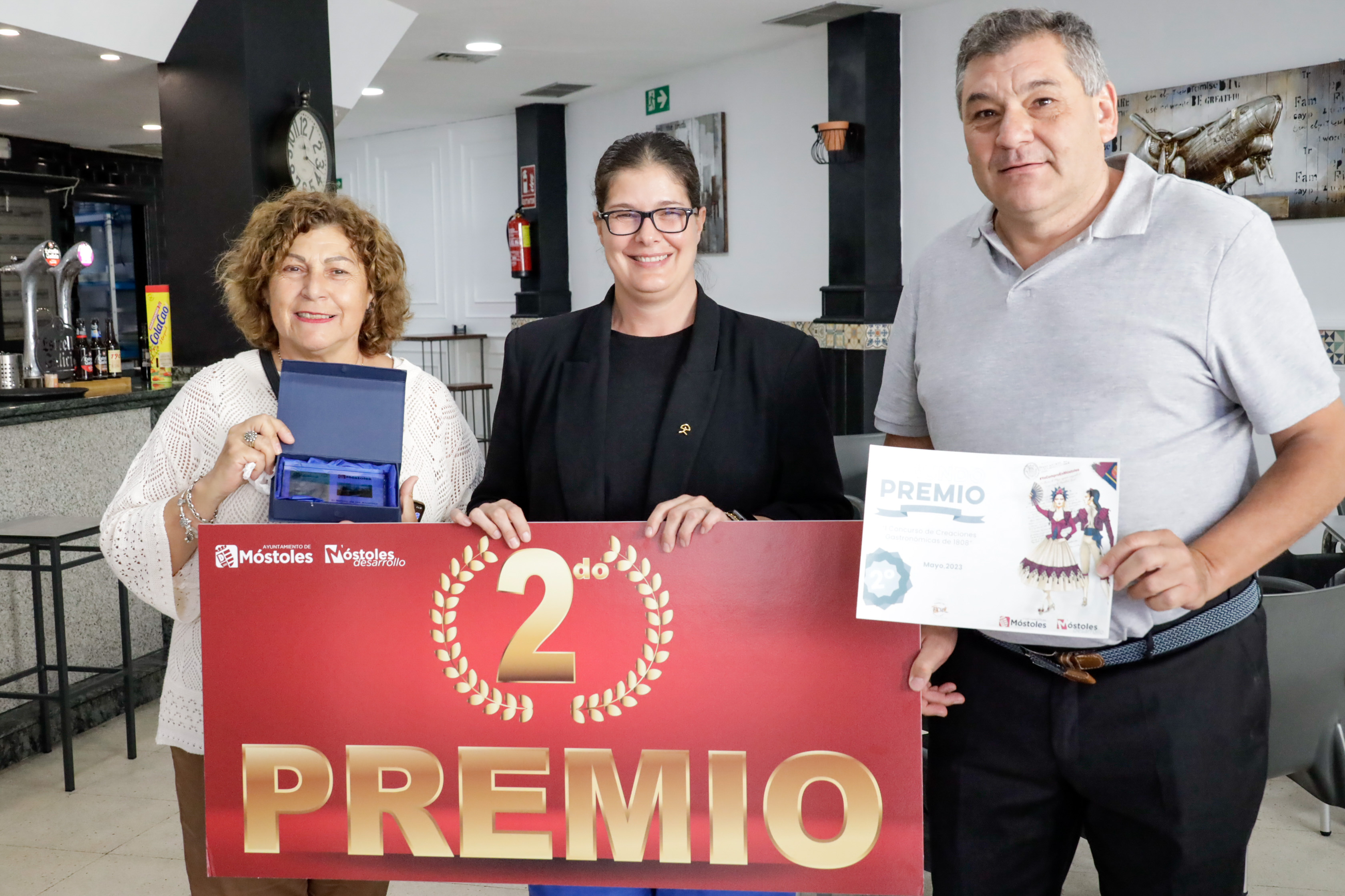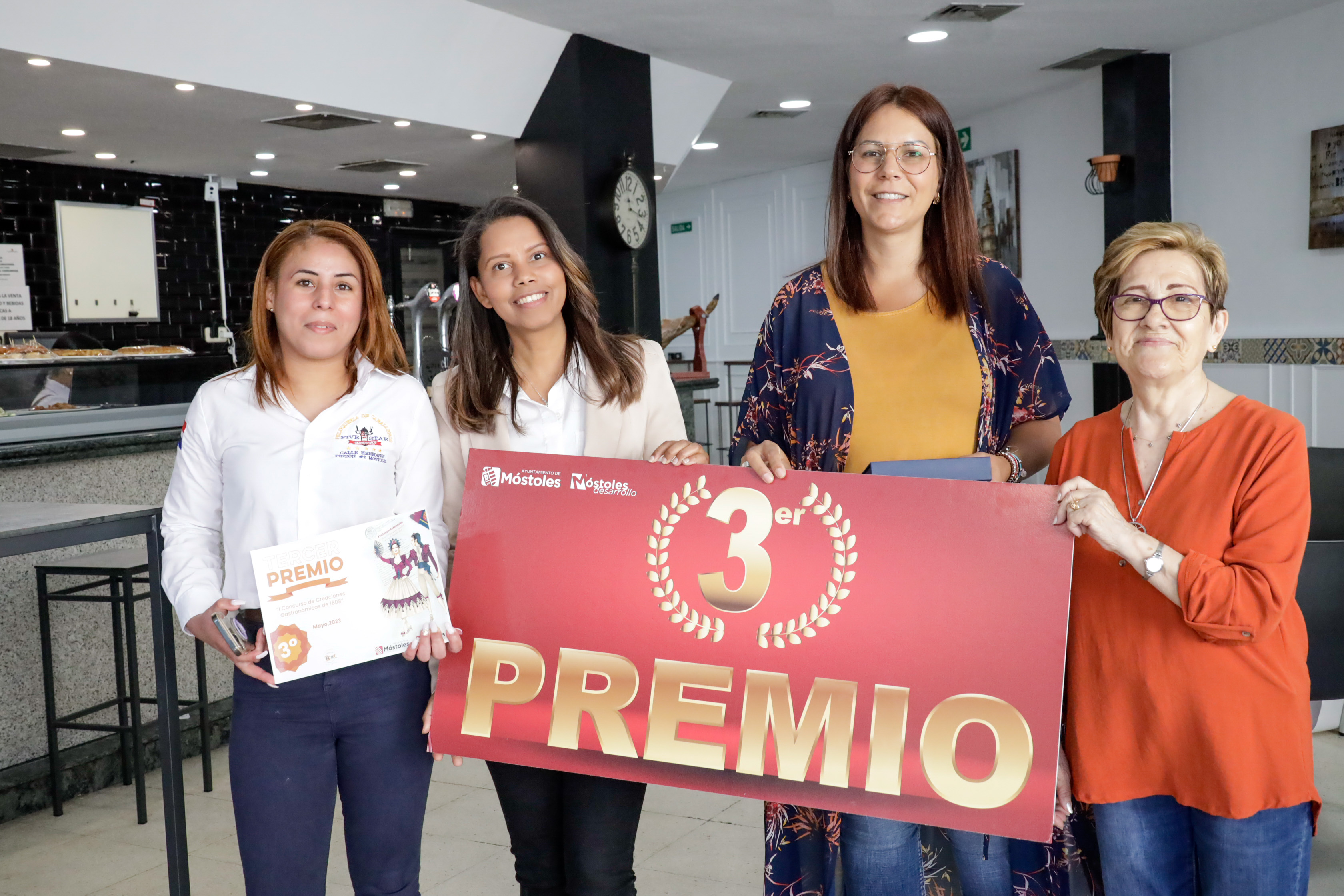 La Alcaldesa, Noelia Posse, acompañada de la Concejala de Empleo y Nuevas Tecnologías, Rebeca Prieto, y la Presidenta de la Coral Villa de Móstoles, Irene Villamiel, ha entregado hoy los galardones a mejor escaparate en la tienda GreenLed y los galardones a mejor creación gastronómica en el bar restaurante Buenaventura.