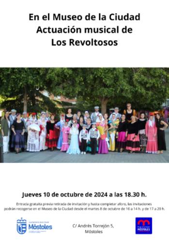 El jueves 10, a las 18:30 h, tendrá lugar la actuación musical de folclore castizo a cargo de la Asociación Cultural "Los Revoltosos", cuyo nombre está inspirado en una de las zarzuelas más típicas de Madrid: "La Revoltosa".