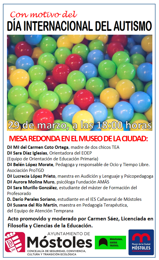 También el miércoles 29 tiene lugar, a las 18:00 h en el Museo de la Ciudad, una mesa redonda con motivo del Día Internacional del Autismo, que estará moderado por Carmen Sáez, licenciada en Filosofía y Ciencias de la Educación y maestra de Pedagogía Terapéutica y Educación Infantil en Móstoles.