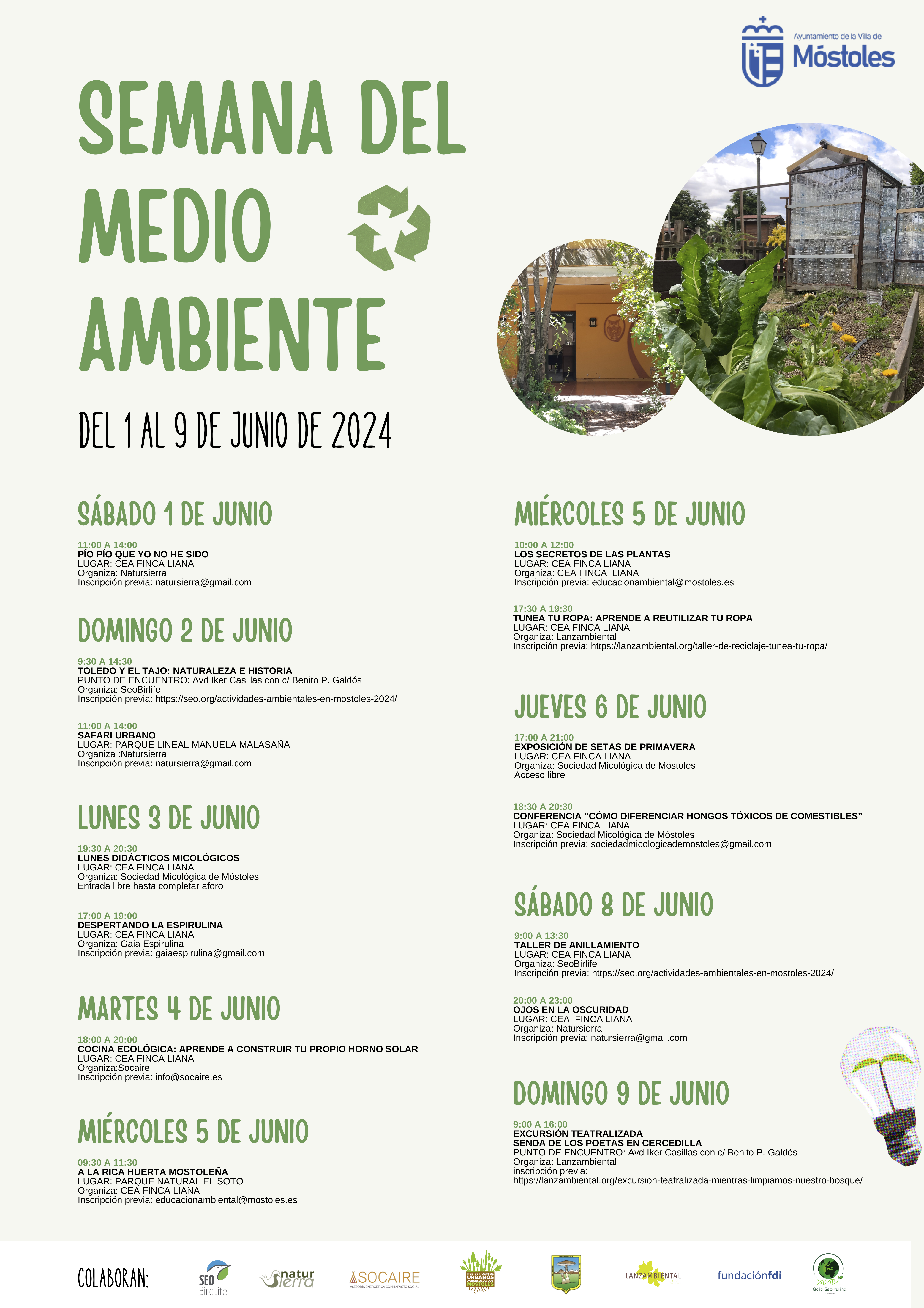 El resto del mes de junio, la Concejalía de Seguridad, Emergencias, Movilidad y Medio Ambiente, en colaboración con entidades especializadas en medio ambiente como son la Sociedad Micológica de Móstoles, Lanzambiental, Natursierra, SEO Birdlife y Socaire (asesoría energética con impacto social), continuará la programación de actividades medioambientales.