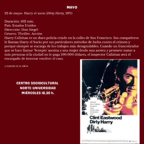 El miércoles 22, en el ciclo de cine Filmoteca se proyectará la película "Harry el sucio", en el Centro Sociocultural Norte-Universidad a las 18:30 h. Las entradas se pueden retirar, de manera gratuita en el propio centro desde el lunes 20 de mayo.