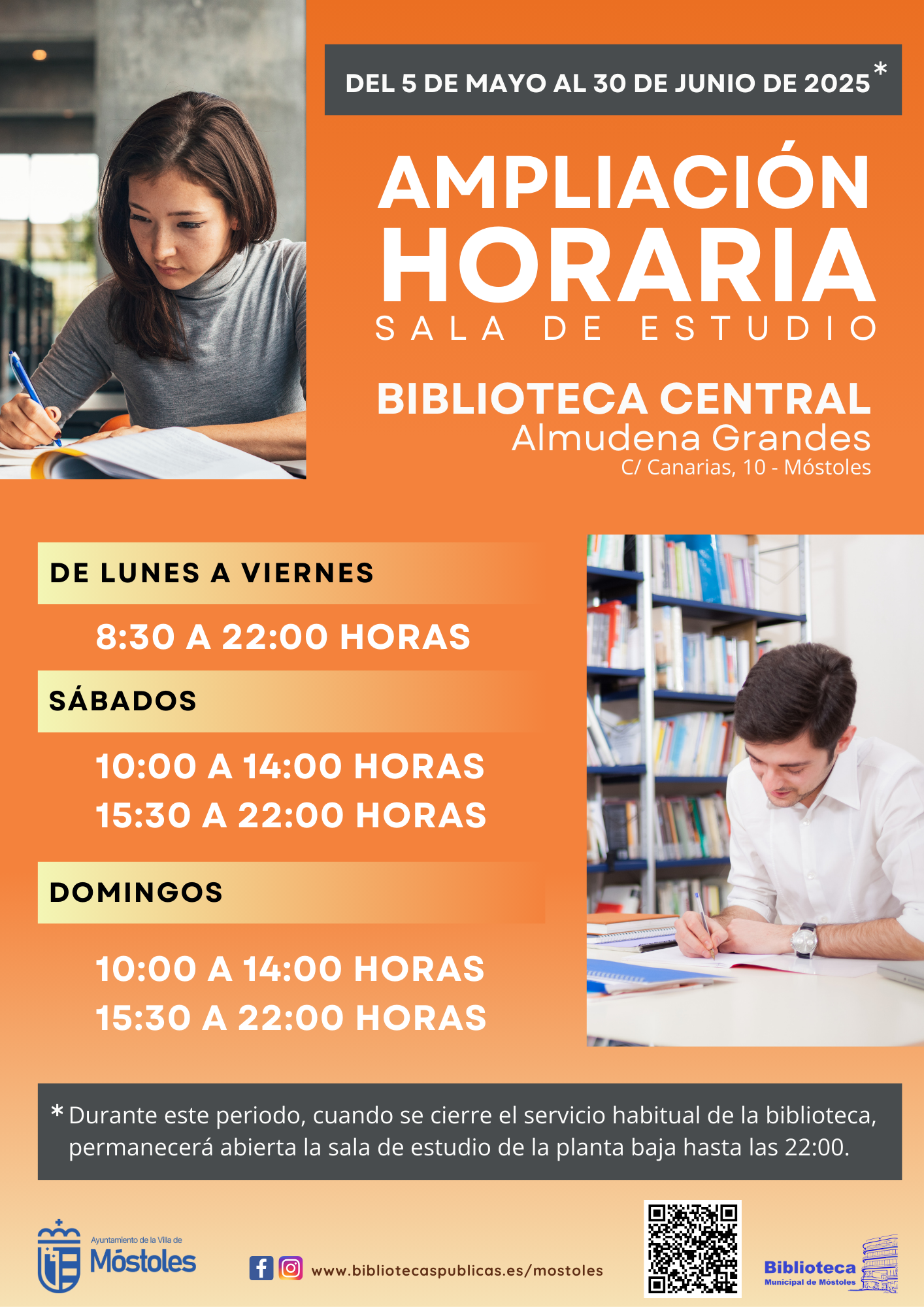 El Ayuntamiento de Móstoles, a través de la Concejalía de Cultura, Desarrollo y Promoción Turística, amplía el horario de las salas de estudio de la Biblioteca Central y de la biblioteca de Parque Coimbra para facilitar a los estudiantes la preparación de los exámenes.