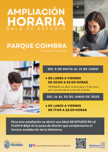 Por su parte, la sala de estudio de la biblioteca de Parque Coimbra, hasta el 13 de junio, estará abierta, de lunes a viernes, de 20:00 h a 22:00 h y del 16 al 30 de junio, de lunes a viernes, de 17:00 h a 22:00 h. Para esta ampliación se abrirá una sala de estudio en la planta baja de la Junta de Distrito que complementa el horario de la biblioteca.