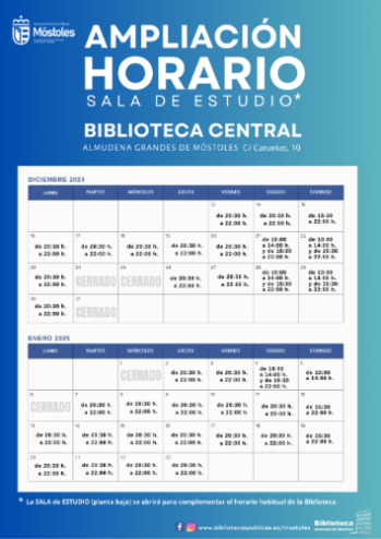 Para dar respuesta a la demanda de espacios de estudio por parte de los estudiantes en los períodos de exámenes, el Ayuntamiento de Móstoles, a través de la Concejalía de Cultura, Desarrollo y Promoción Turística, amplía los horarios de las salas de estudio de las bibliotecas Central y Parque Coimbra del 13 de diciembre al 23 de enero.