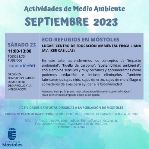 El Ayuntamiento de Móstoles ofrece, en colaboración con la Fundación para el Fomento del Desarrollo y la Integración (FDI), el taller "Ecorefugios en Móstoles", dentro de la programación de actividades y cursos gratuitos sobre medioambiente puesta en marcha este mes de septiembre.