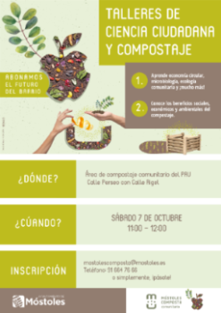 La Concejalía de Seguridad, Emergencias, Movilidad y Medio Ambiente llevará a cabo dos talleres dirigidos a todos los mostoleños, sin limitación de edad. La primera actividad se realizará el sábado 7 de octubre, de 11:00 h a 12:00 h, en el área de compostaje comunitario del PAU-4, situada en la confluencia entre las calles Perseo y Rigel.