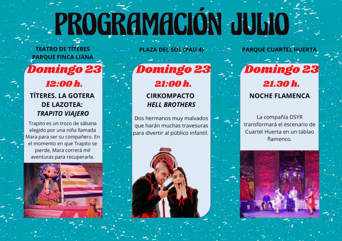 La Plaza del Sol, en el PAU-4, será el escenario a las 21:00 h del domingo del espectáculo "Hell Brothers", de la compañía Cirkompacto. Estará protagonizado por dos hermanos muy malvados, cuyas travesuras harán divertir al público infantil.